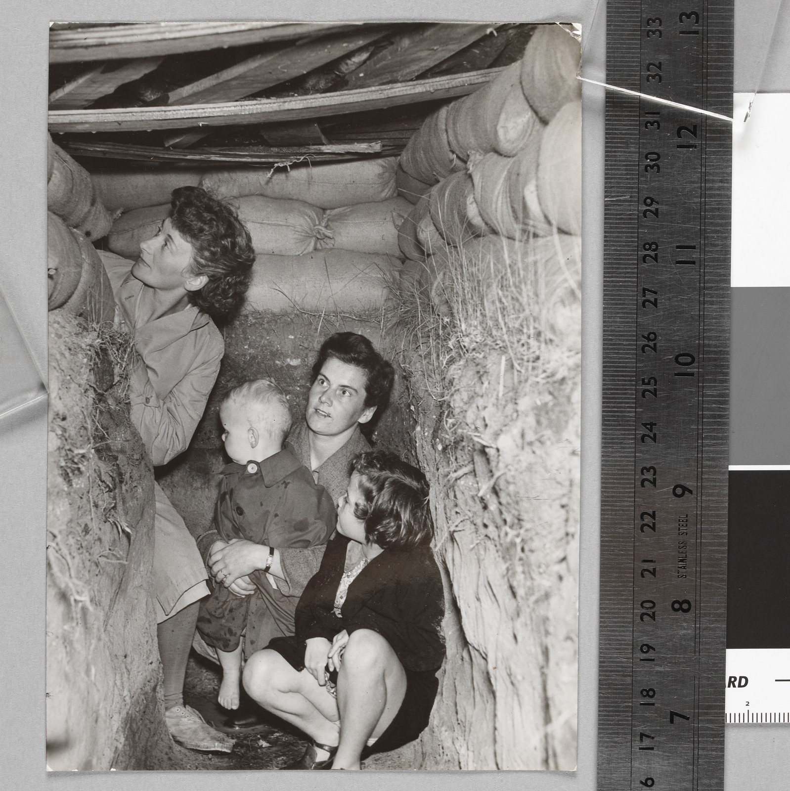 Early in the war, it was feared that Australian cities such as Melbourne and Sydney would come under attack from air-raids, and many suburban householders dug shelters in their backyards. These women are practising for the cameras, as the raids themselves never came.