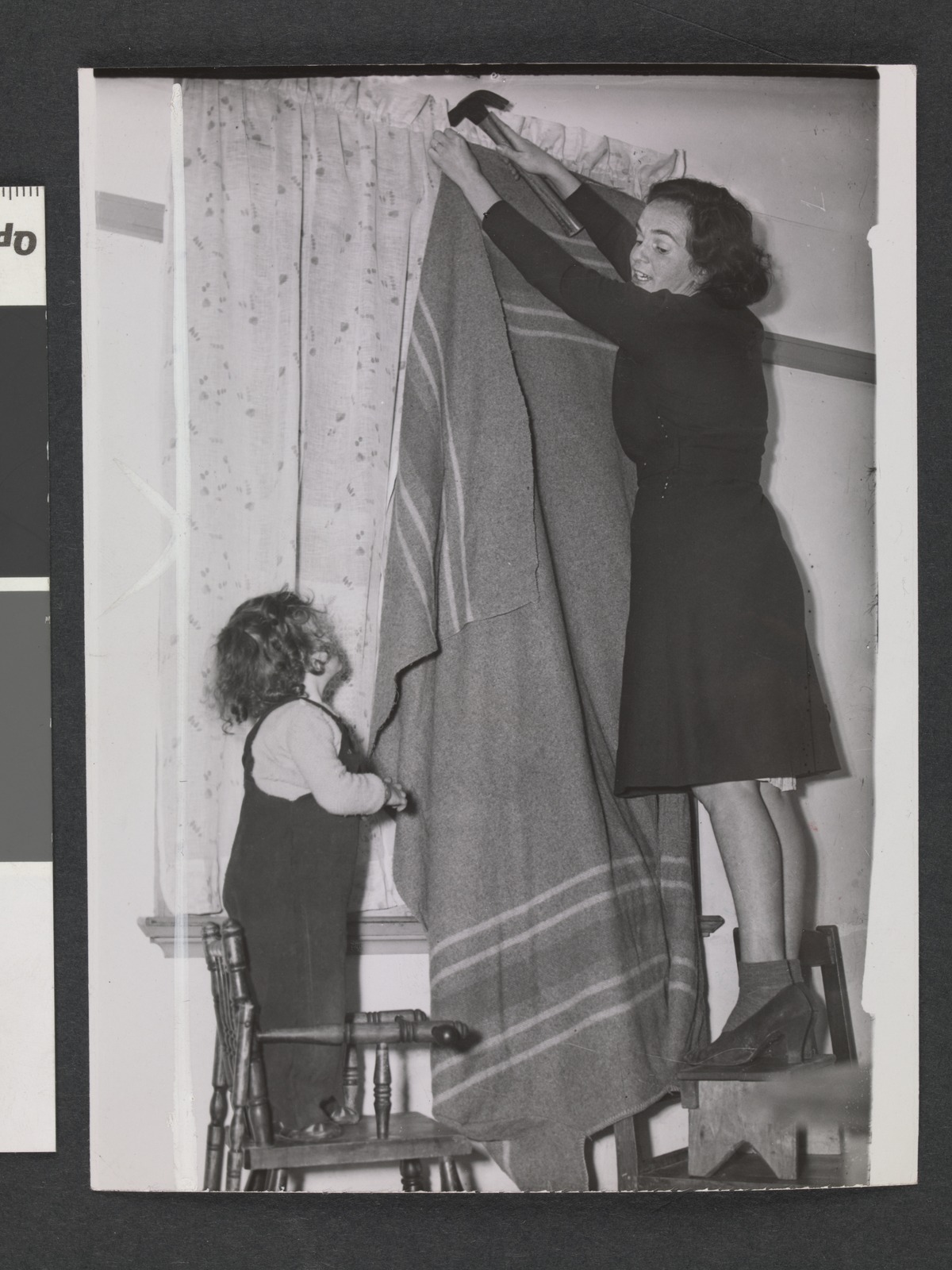 This woman takes a precarious perch (and in high heels) to nail up a blanket so that her home will show no lights in the event of an air raid, while her daughter looks on. As enemy aircraft would use the lights of a city at night to guide them to their targets, blackouts were an important part of civil defence.