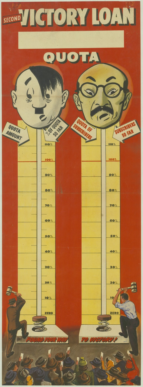 Victory Loans were the government's way of raising much-needed money from the savings of soldiers and civilians. These loans were paid back with interest after the war. This poster encourages people to think of it as a test of strength, against the hated figures of Adolf Hitler on the left, and Hideki Tojo, the Japanese Prime Minister, on the right.